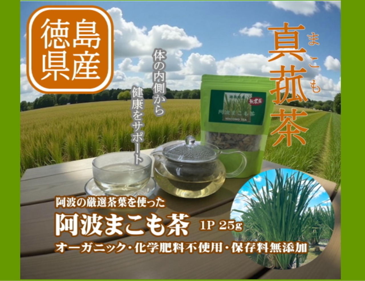 - 徳島県産のまこもを100%使用。自然の中で丁寧に育てられ、風味豊かに仕上げられています。日本で製造されています。