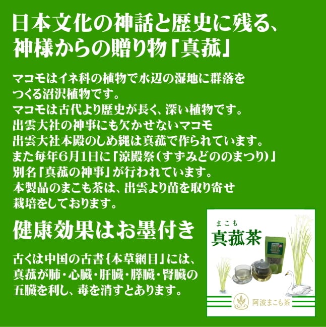 - 徳島県産のまこもを100%使用。自然の中で丁寧に育てられ、風味豊かに仕上げられています。日本で製造されています。