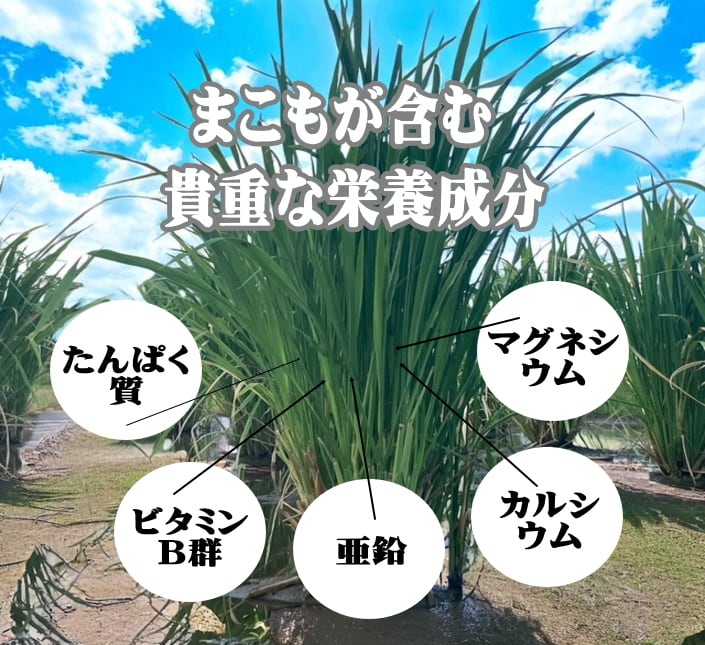 秋に実る茎の肥大部「まこもだけ」は、淡白で歯ごたえのよい食材として親しまれ、ビタミンやミネラル、食物繊維を豊富に含む健康野菜です。葉は乾燥させて「真菰茶」となり、ノンカフェインで体を内側から整える飲み物として愛用されています。